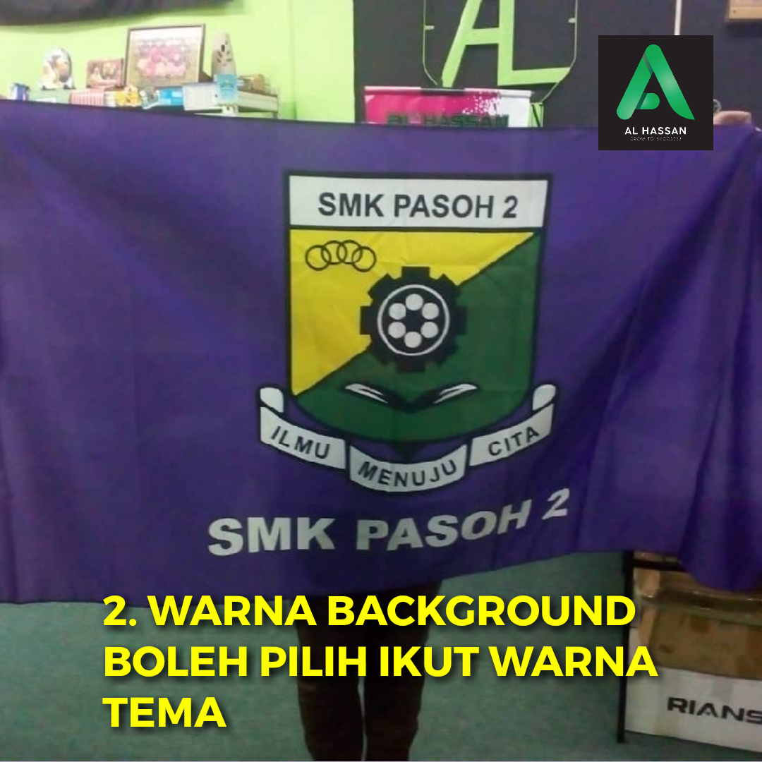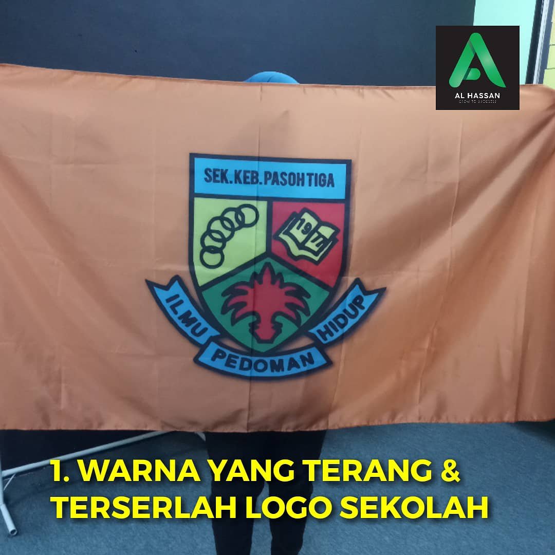 Cetakan ‘full colour’, maknanya tak kisah berapa banyak warna logo sekolah cikgu tu. Begitu juga warna latar belakang bendera, tiada limit warna.