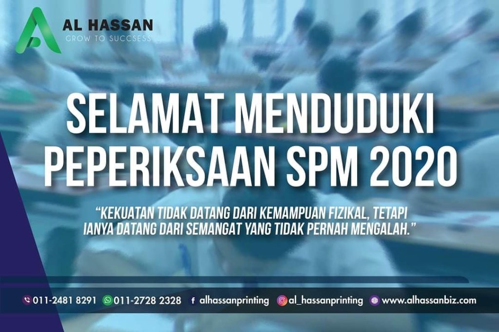 Selamat Menduduki Peperiksaan SPM 2020 kepada semua calon. Bertenang & lakukan yang terbaik.. Posted byalhassan printingFebruary 22, 2021Posted inUncategorized Selamat Menduduki Peperiksaan SPM 2020 kepada semua calon. Bertenang & lakukan yang terbaik.. Alhassan Printing Share this: Click to share on X (Opens in new window) X Click to share on Facebook (Opens in new window) Facebook Like Loading...